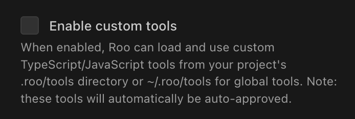 Critical: When enabled, custom tools are auto-approved—Roo runs them without asking. Disable if you don't trust the tool code.